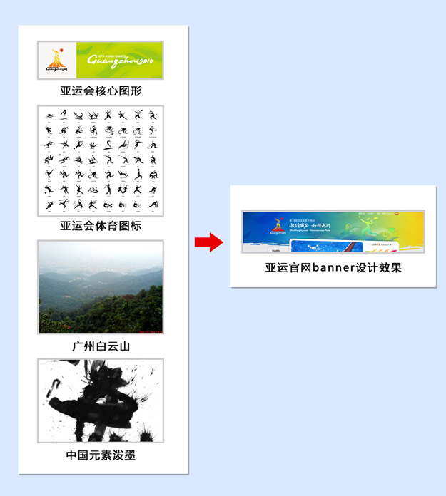 以上是顶部banner的设计思维图;作为一个网站最显眼也是最能体现整个网站形象的一个区域,我们采用了具有中国特色的泼墨形式,并将亚运会VI图案、运动人物标识、连绵的山脉等元素组合在一起。右侧运动人物标识还有一个特别之处,我们设计了多套不同的运动图案,每次访问页面会随机打开其中一张,力求让用户每次访问都有些不同的感受,以增加官网的层次及趣味性。运动人物下方的抽象连绵山脉,则是使用亚运核心图形重复排列构成,以突出广州特色——白云山。