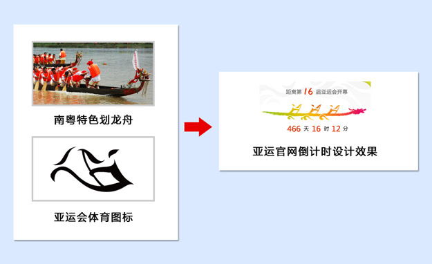 倒计时区:前面提到,倒计时区域的设计相比旧版需要做的更加的突出。因此我们摒弃了一般的倒计时功能所特有纯数字、呆板无聊的特性,结合真实的划龙舟图片和亚运体育图标中的龙舟,设计出了这个倒计时的形式,并且用FLASH制作出龙舟划动的动画效果,更加能够成为用户目光的焦点。