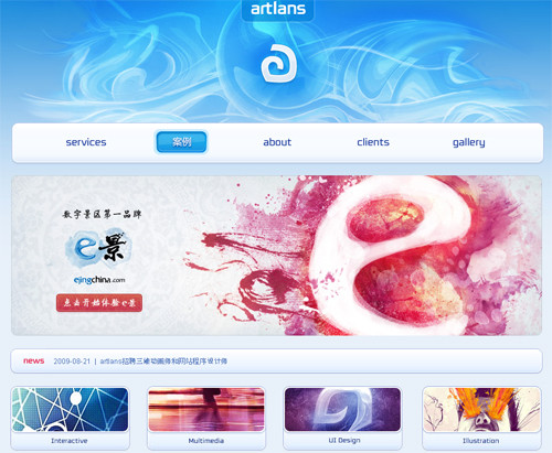 Artlans, 是一个交互设计工作室,主要是菜单按钮,点击按钮,以及语种转换按钮。设计工作室一般不愿整站使用 Flash,而是在某些主要的位置,借 Flash 显示他们 Flash 技巧。