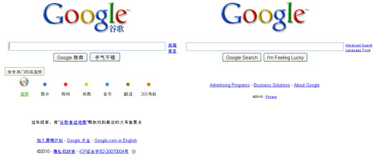 Google 以简洁著称,但比较一下 Google China 和 Google US 就能看多一些细微的差别: