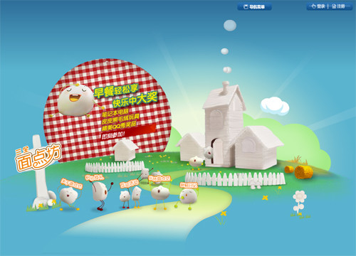 Mian Dian Fang, 一家即食早餐公司,其公司网站也大量使用 Flash。动画中,馒头包子一起做早操,以显示该公司的健康食品理念。