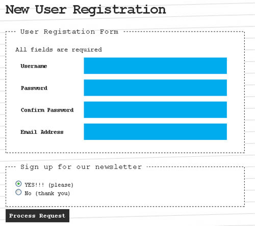 fieldset>默认会带边框,不过可以修改,通常会通过CSS来去掉.下面是单独表单一个例子,它使用<fieldset>和<legend>分割成两个部分