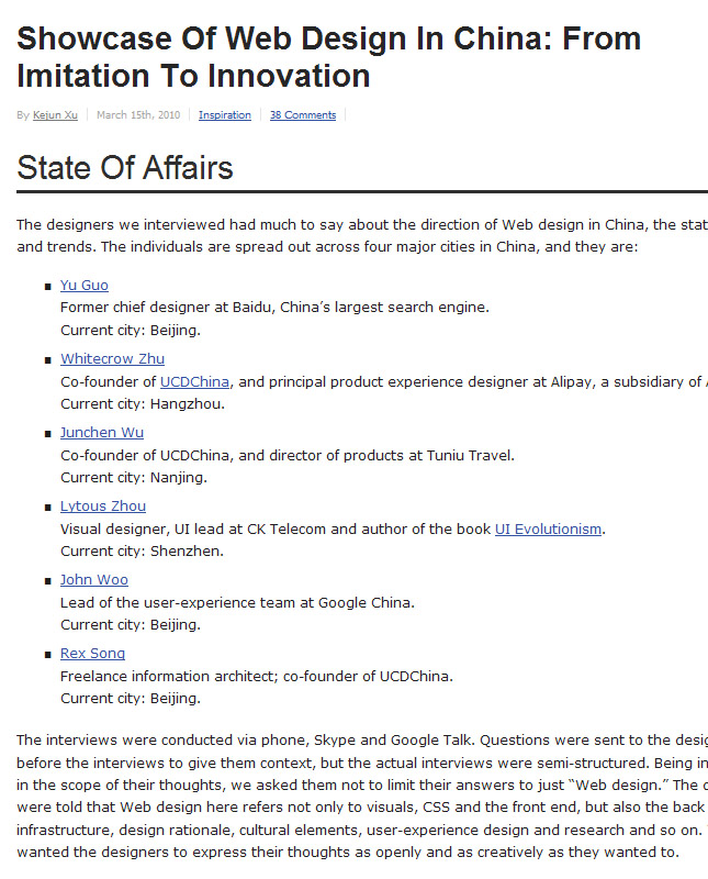 今天,Smashingmagazine最后定稿发布了《Showcase Of Web Design In China: From Imitation To Innovation》的文章,这是一篇面向国内WEB设计圈生态和中国WEB设计行业的调查分析,我有幸参与了其中,各位可以移步到官方网站浏览,我就不贴原文了。