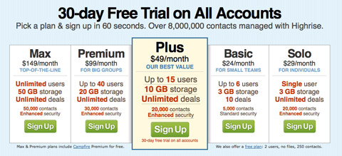Highrise的价格清单对最受欢迎的那一项使用了突出的设计,帮助你选择它.