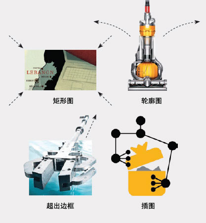 对图片的剪切能够传达特定的含义——矩形图片显得正规低调,轮廓图显得开放自由,超出边框的剪切传达出动感,插图传达出象征意义及艺术感的视觉效果。