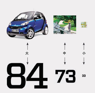 在真实的生活中尺寸传达出两种含义——大和小,远和近。同一尺寸的元素显得静态。而将各种尺寸元素混合在一起,便传达出深度、动感及活力。