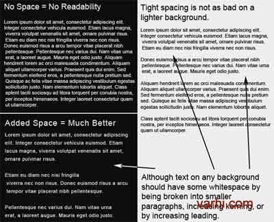 注意,在淡色调上阅读小文字内容要比深色调上容易的多。当在新的网站上设置字体的时候,一定要事先虚拟一些内容以确保其清楚易读。如果不清楚的话,可以尝试增加一下字体的大小来调整。