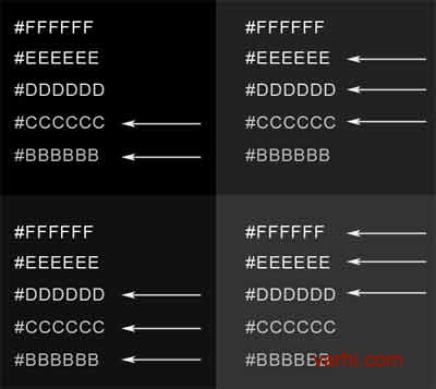 下面的例子简单的说明这点,如何平衡字体与背景之间的对比度。注意当让背景颜色变浅时其上面的文字也会一起变浅的。