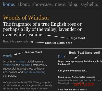 增加字体大小是提高深色调网页内容可读性的另外一种方式,同文章以上介绍的方法一样,大号的字体能增加其本身及周围的留白,字体越大其周围的留白空间就会越大。