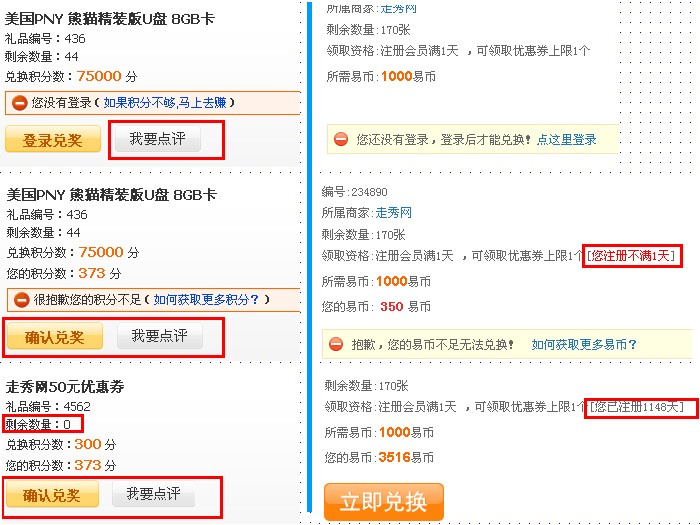 3、 如果用户登录且积分足够,用户最需要什么交互?兑换。这个时候用户是否需要“点评”交互?我觉得不需要,还没有兑换使用,怎么点评?“点评”这个交互行为 应该出现在用户兑换之后再次浏览到这个物品的时候。