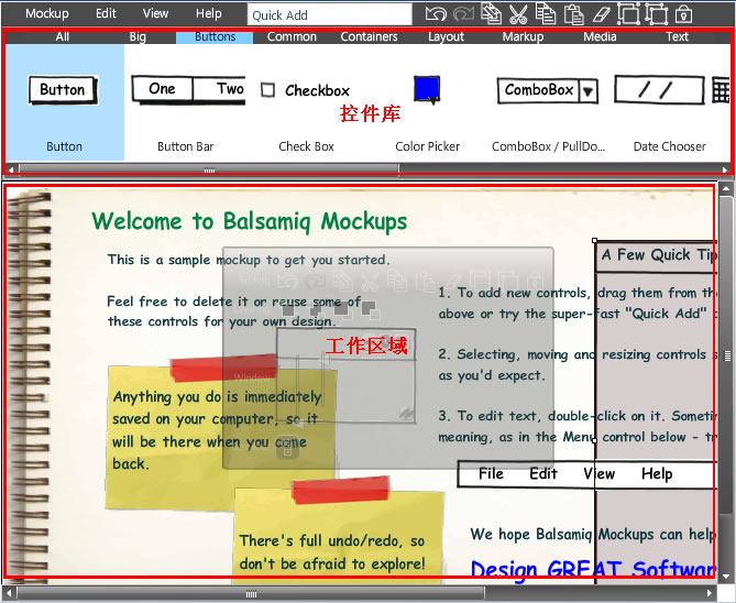 Balsamiq Mockups:操作类似FW,通过顶部的控件库拉取到工作区域画wireframe。