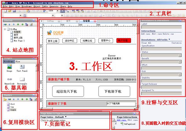 Auxre RP:基本操作也和FW,Mockups类似,3是工作区域,从5控件库里拉取到工作区域画wireframe。
