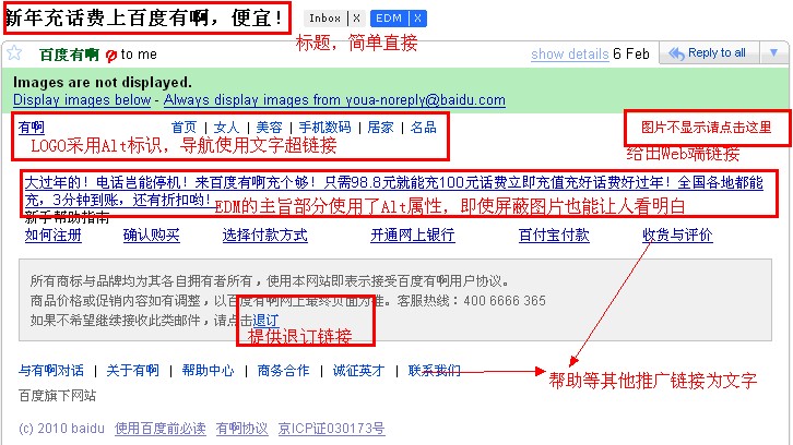 >>对于引导:一般的EDM都会在web端留一个源地址,所以,请在你的EDM的明显位置给出一个超链接,“如果图片无法显示请点击这里查看”,这样就算被屏蔽了也能引导部分用户。