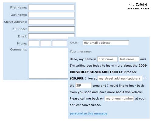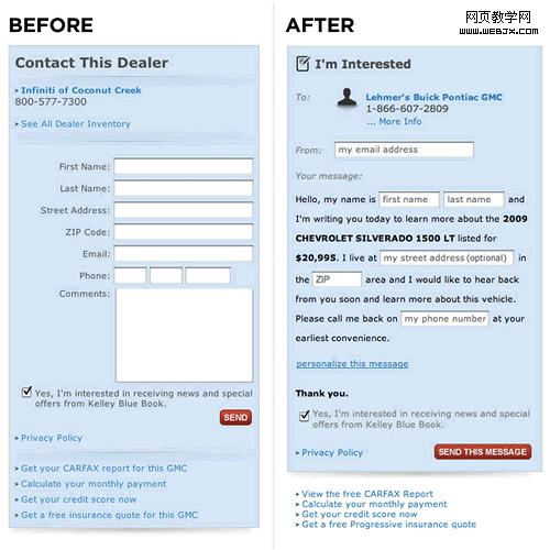 指示性的”联系这个经销商”,被换作第一人称“我感兴趣”。同时也避免了“经销商”这个往往给人虚伪感觉的词。