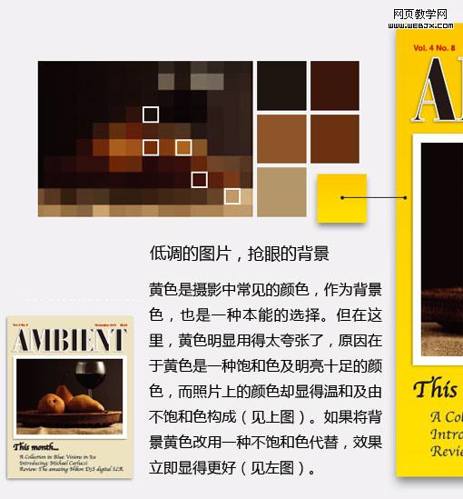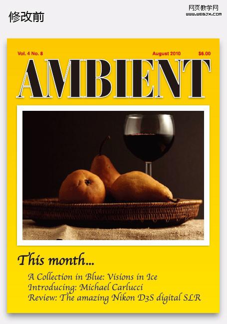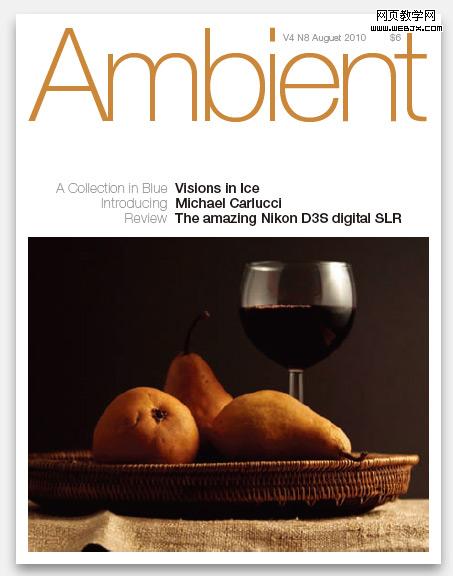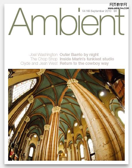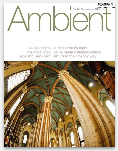 这本杂志,有个好名称,有张好照片及少量的文字,但上面的设计,却显得过于喧哗。版面上有太多复杂的元素使到你无法将注意力放在照片上!柯达黄如果是小面积使用效果非常不错,但在这里,却显得过于抢眼。杂志名称使用粗体及全大写字母,而且还有描边效果及使用了阴影,这与“Ambient”一词所传达的意义是背道而驰的。而照片,感觉漂浮的效果及加边框的设计,再加上那些过于飘逸的字体,都使到整个版面显得过于造作及不真实。让我们将这些复杂琐碎的东西通通扔掉,直接让图片来成为一号主角。