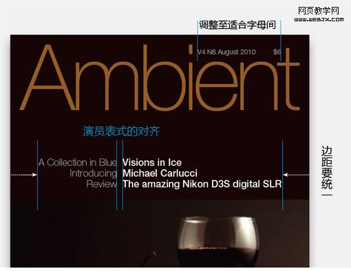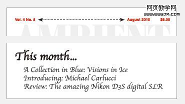 原来的文字排版是任何一个人都可以做到的,这里左对齐,那里右对齐,然后个别再缩进一些。这样的文字排版仅仅是起到传达信息的作用,但没有吸引力。通过对文字的精心安排,我们可以使文字传达出一种美感、优雅及权威。在下图,标题文字均采用同一种尺寸,只是粗细的区别,并且采用了中间对齐的排版,象电影职员表的设计。其中的文字长度会随着内容不同而改变,整个文字区域显得非常有趣,而且每一期给人的感觉都有所不同。几个小标题就已经对整个背景空间形成了不规则的分割。期刊号、出版日期及价格等文字尽量缩小,放在了上方名称的字母间,而且文字采用了细体,并呈灰色,由于位置的独特,所以他们虽然尺寸很小,但仍然能够轻易阅读,并且成为了一个视觉点。