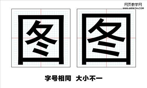 我们有必要先来搞清楚两个不同的概念:“字面大小和字身字面比”。字体设计专用方格都有两个方框,外框称字身框,内框称字面框。