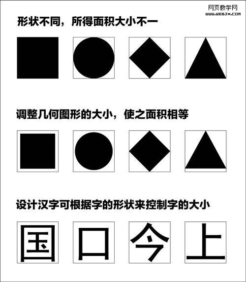 从几何形角度来看,汉字形状众多,最典型的可分为四种类型:“方形、圆形、三角形和菱形”,从面积上看方形最大,菱形最小,要想把图形面积变得一样大小,就必须按菱形大小走,这样设计出的汉字才能在视觉上保持一致。