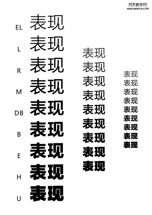 下面通过调整统一字体的粗细,来了解笔划粗细与结构、留白、重心之间的关系。为了更好的说明问题,便于理解,选用多笔划和少笔划的粗体字为例。