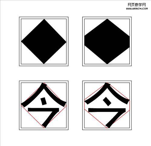 要想做大字面的字,我们首先要考虑面积最小的菱形,那么,怎样才能把菱形字做大?很简单,只要适当调整改变菱形的形状,那么,我们就能得到比原来菱形面积大的形变图形,用这种方法来设计,就可以得到在视觉上比原先字面大的字。