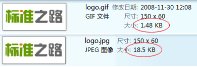 看看本站的logo,同样尺寸的图片,保存成gif格式要比jpg格式小多了,把图片放大时会发现jpg格式会产生噪点,质量还不如gif,那 当然要选择gif了,因为这个logo色彩非常单一。