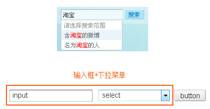 新浪微博的搜索框,将下拉选项融合到输入框提示里,选择搜索范围的操作更加便利。