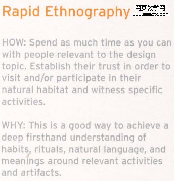 近期有机会展开实地调研,尝试将ethnography(人种志)方法用起来,但我远不敢称此类研究就是人种志研究了,最多能算是以下这张IDEO方法卡所谓的敏捷人种志研究——