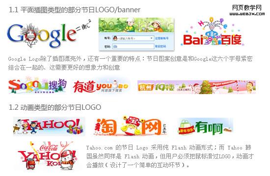 我们对网络上的节日LOGO进行了一下简单的分类,大概分为平面插图、FLASH(or Gif)动画两种类型,而FLASH动画里面像Yahoo Korea等的国外网站,动画更加有互动效果。平面插图的节日LOGO通常都画得相当精美,而Google Logo除了插图漂亮外,还有一个其它网站比较难模仿的特点:节日图案创意是和Google这六个字母紧密结合在一起的,这除了画画漂亮外,还必须具有无限的想象力,当然,应用环境的高度简洁也是其显得突出的一个重要因素。