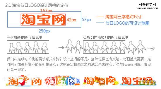 由于淘宝首页的内容很多,考虑首页整体下载速度之后,前端分配给我们LOGO可以设计的区域(包括淘宝网三个字)大概为250*53px(2009版首页的节日LOGO尺寸),如果用插图的形式来设计,图形信息量比较少,而且还难以跳出前人的框框,所以我们决定以时长线的展示形式来弥补设计空间的不足,即用小动画来设计LOGO。(六一儿童节之前的淘宝动画LOGO相关设计请查阅:http://ued.taobao.com/blog/2009/05/18/2009%E6%B7%98%E5%AE%9D%E7%BD%91%E5%8A%A8%E7%94%BB%E8%8A%82%E6%97%A5logo%E7%AC%AC%E4%B8%80%E5%AD%A3/ OMG,大半年前发的文章居然忘记将Chinese URL改成English…)。当然,这样做也有风险,动画故事情节推进需要一定时间,如果开端不能吸引住受众,大家在定格画面之前早已失去耐心。