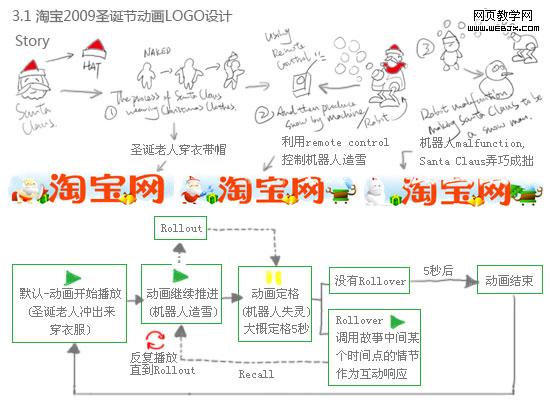 设计六一儿童节LOGO的时候,我们采用的是bonus情节的方法,也就是说,如果用户鼠标不与LOGO发生互动的话,是看不到奖励的故事情节的。而2009圣诞节及2010的元旦LOGO是采用Recall的方法,当动画播放到定格时,鼠标响应区域出现,rollover则重新播放之前已经发生过的某个情节。