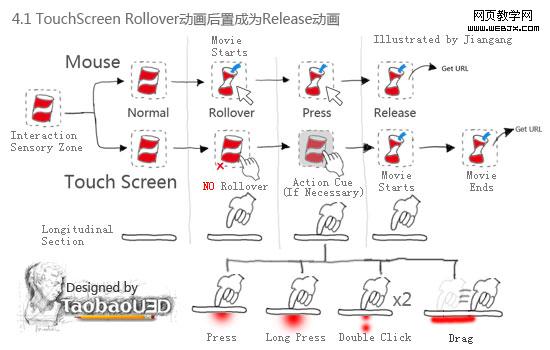 使用触摸屏时,手指放在感应区上方悬停,并不能触发交互动作,因此绝大部分情况下,是没有Rollover状态的(触摸屏加上WII技术又另当别论)。所以,响应用户点击行为的提示动画会在手指按下(Press)并且脱离接触(Release)的那一瞬间才开始。(注意是Release时才开始,如果在Press时动画就开始播放,手指就会把动画部分挡住。) 另外,比较高级的触摸屏终端支持指尖长按(Long Press)、拖曳(Drag)等行为,设计时可以作为交互动作的补充。