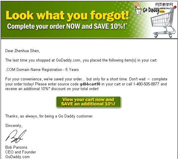 前些天在GO DADDY注册了个账号,试了下它的购买流程,因为测试,到最后付款页面我就关掉了,结果,3天后,邮箱收到它的邮件: