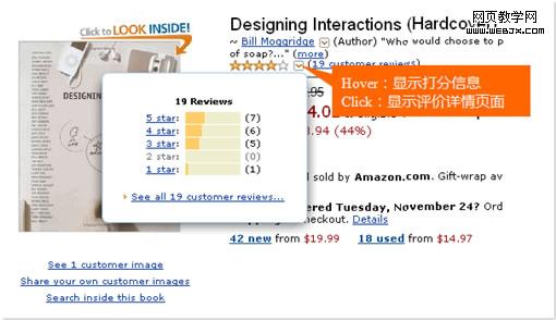 Amazon用另外一种方式来解决多功能的展现。星星打分的信息包括两方面:鼠标悬停展现弹出层显示每颗星的打分人数;鼠标点击后显示评价详情页面。如果把这两个信息同时通过点击星星来实现就会出现上述类似问题。Amazon则是通过增加一个类似下拉的按钮来承载鼠标悬停的交互行为,把点击行为只留给星星。