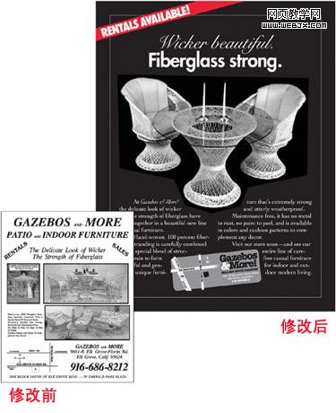 原来的宣传单张并不理想。这个店到底在卖什么?户外凉亭还是家具 ? 纷乱的页面只会让读者迷惑。页面上的店铺地址,电话,地图都着意地处理得比较低调,避免喧宾夺主,但却没有很好的突出最核心的东西——产品!