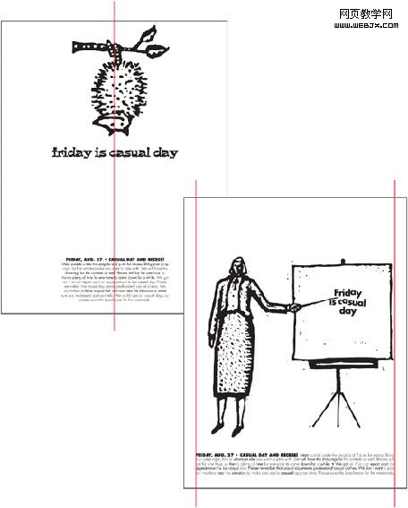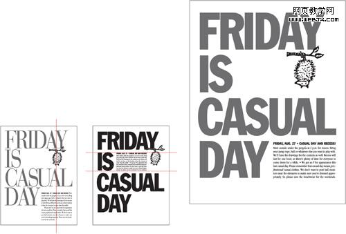 这个例子里图形是老大,图形传达的信息不像文字那么直接,不过更令人玩味。不论是倒挂的小动物还是讲座都不是直接联系到“休闲日”的主题,但是又有某种联系,记住,图形的作用是创造一种感觉和氛围。例子中的图形很拙朴,配合简洁朴素文字,居中或是左右对齐都可以,同时注意留白。如果你是个新手,可以暂时不必用纵向的辅助线对齐,看着大致差不多就行了,如果你图形工具比较熟练,运用辅助线可以使设计更专业。