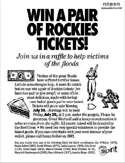 不同的标题会产生不同的效果,原来标题是“为救助中西部水灾灾民的抽奖活动”,换了以后是“抽中就得两张洛基队的棒球比赛门票”,焦点从别人转移到了参与者自己,这样一下子就抓住了他们的注意力,同时醒目的字体也给人兴奋的感觉。现在我们已经吊足了他们的胃口,你可以继续你的推销,比如这里还有价廉物美的烤制食品。如果文字中有你要强调的重要信息,那最好加粗这些词语,吸引读者的注意,同时加上一些小插图作为调剂。例子中的插图主要就是为了强调我们推销的主题,正好对应“一美元的门票”和“便宜烤制食品”的含义,统一的图形风格效果很好。