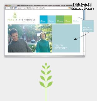 如果你将一个元素、颜色或者位置组合作为一个视觉元素来重复应用,那你就无形中创造了一种“风格”。如果这种重复应用能够给人留下印象,那你就可以将它作为一个主题。主题比文字更容易“阅读”,还能够给人留下深刻印象。为了说明这一点,我们看一下 Parc Rittenhouse 公司是如何利用矩形及春天的颜色来作为它们网站的主题:
