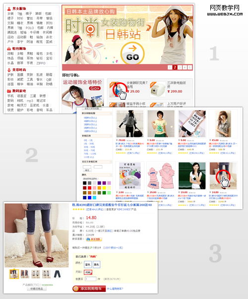 第一步,首页上点击某促销广告(弹出新窗口,出现产品List页面);第二步,产品List页面上点击某产品(弹出新窗口,出现商品Detail页面)。