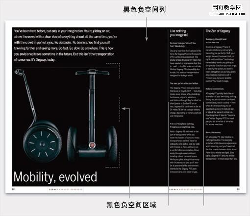 版面中无论是纵向还是横向,都是由矩形区域构成。留意产品图片放置在一个黑色的背景中,同时产品图片区域形成一个矩形区域,这种视觉辨别是通过负空间及其相邻的各种相对元素来衬托的。而最右边的文字列采用了灰色,显得非常低调,没有与左边形成过强的视觉冲突。