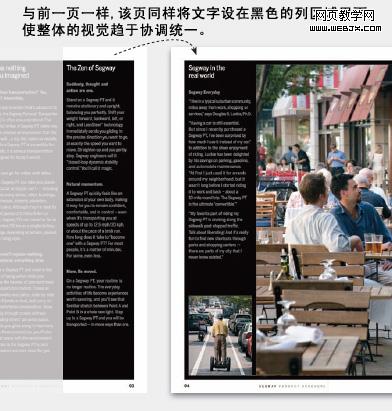 在内页中,版面设计具有两个层次,一个是用于观看,另一个是用于阅读。大图片及简短的大文字是用于观看,而常规尺寸的细节信息文字则用于阅读。大块的黑色区域建立起一个视觉主题。