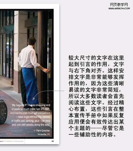上图左方大尺寸文字及一张大图片形成一个容易“阅读”的焦点,这种设计形式贯穿整本目录的版面设计中。段落文字增加了视觉的图案感,该部分白色文字区域较宽,与右边较窄的灰色文字形成了对比。