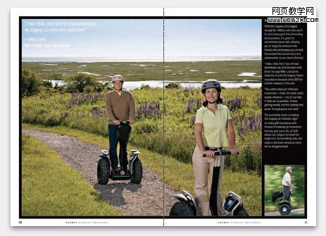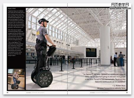 这本产品目录重复应用同一种设计手法,即大图片及较大的说明文字,而正文字体尺寸则非常小,主要的目的是要让读者能够真实体验 Segway 在真实环境中使用的效果。在如下的版面中,通过展现产品的使用或个人享受体验来使读者加深对产品的了解。