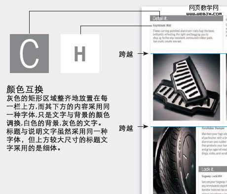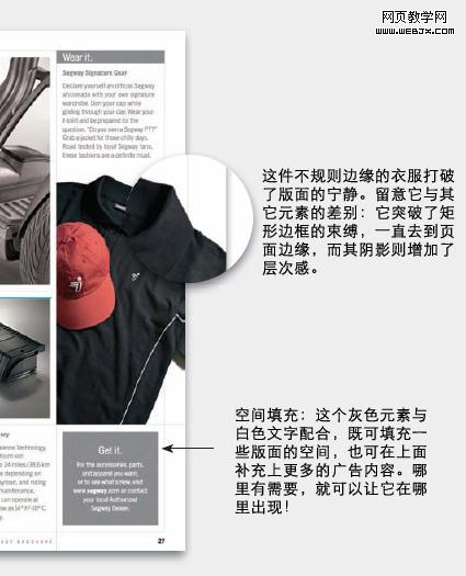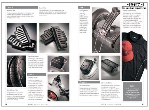 在介绍附件的版面中,各种零配件图片尺寸、形状及文字说明都不一样,而利用矩形来安排则可以使这些看似零乱的元素变得协调。其中,元素的对齐关系是关键。