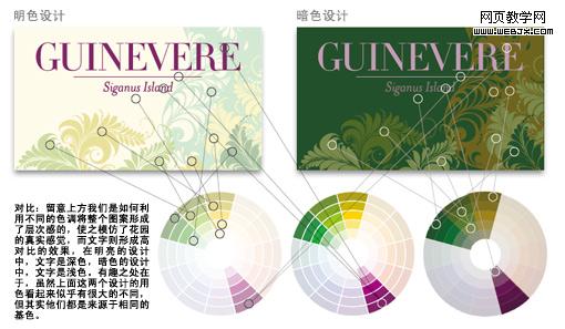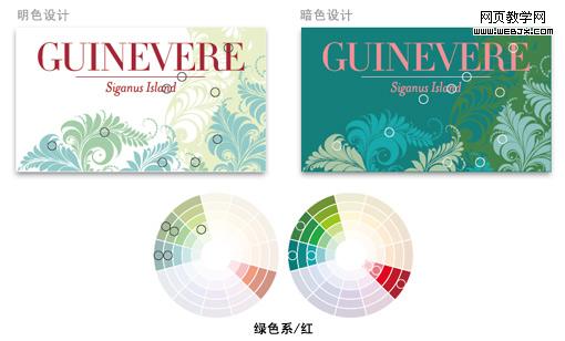 现在我们要做的是,利用色轮分成十二个步骤及明暗两种色调来设计卡片。花纹图案将会采用类比色搭配,而文字则采用与其相对的补色,看一下效果如何: