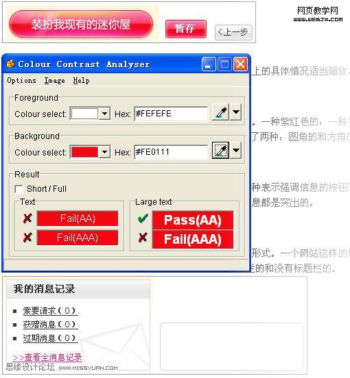 截图中使用对比度检查器,基于W3C的WCAG Guideline 1.4.4和1.4.2中有相应的规定,工具的下载和具体说明可见 油茶会的这篇。