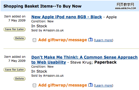 用户经常会把商品放进购物篮后,付款前再核对一下购买的商品,看看他们是否确定要买这些。商品如果只有标题,他们就无法再快速地浏览核对一遍。所以,最好加上图片,商品说明—比如大小,颜色,精装书还是平装书,等等。