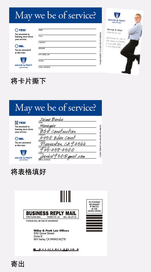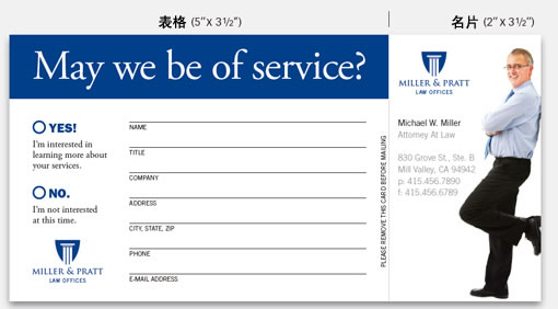 (注:上面的律师事务所宣传卡片中,左为由收件人填写的表格,右为律师联系名片。左方的表格区域是让有兴趣的目标顾客填上自己的联系信息寄回律师事务所)