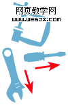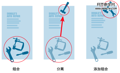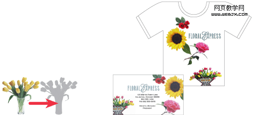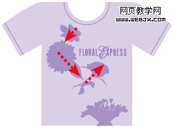 当你布置这些图形时,要注意图形视觉上的重量、平衡和视线转移的路线。将这些图形元素分成不同的组,每个组和其他的组都有相互平衡的关系,先把主要的组放在开阔的地方,然后把单个的图形或是比较小的组放在周边的位置上,注意文字块本身也是有重量的,也是我们考虑平衡的一个部分。很多图形比如螺丝刀,扳手等都有它本身的指向,我们的视线会不自觉地跟随这个方向移动,这个特性很有价值,可以引导读者视线在页面上移动。下面这个 T 恤的设计里,三个花朵包围着中间的名称,并指向它。