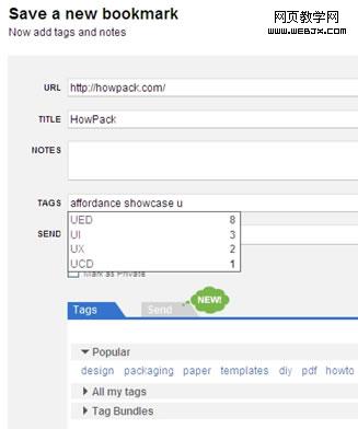 在Delicious上收藏URL时,每输入一个Tag都有Tag池中同首字母的罗列。下方列有个人常用Tag,且优先放置与该资源可能相关的Tag。并有他人常用Tag的罗列。