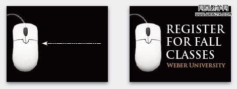 上图左,使用一张简单且常见的象征图片,将背景设为黑色,使其与白色的鼠标形成强烈对比,但鼠标本身并不能传达网上报名注册这一信息,所以……